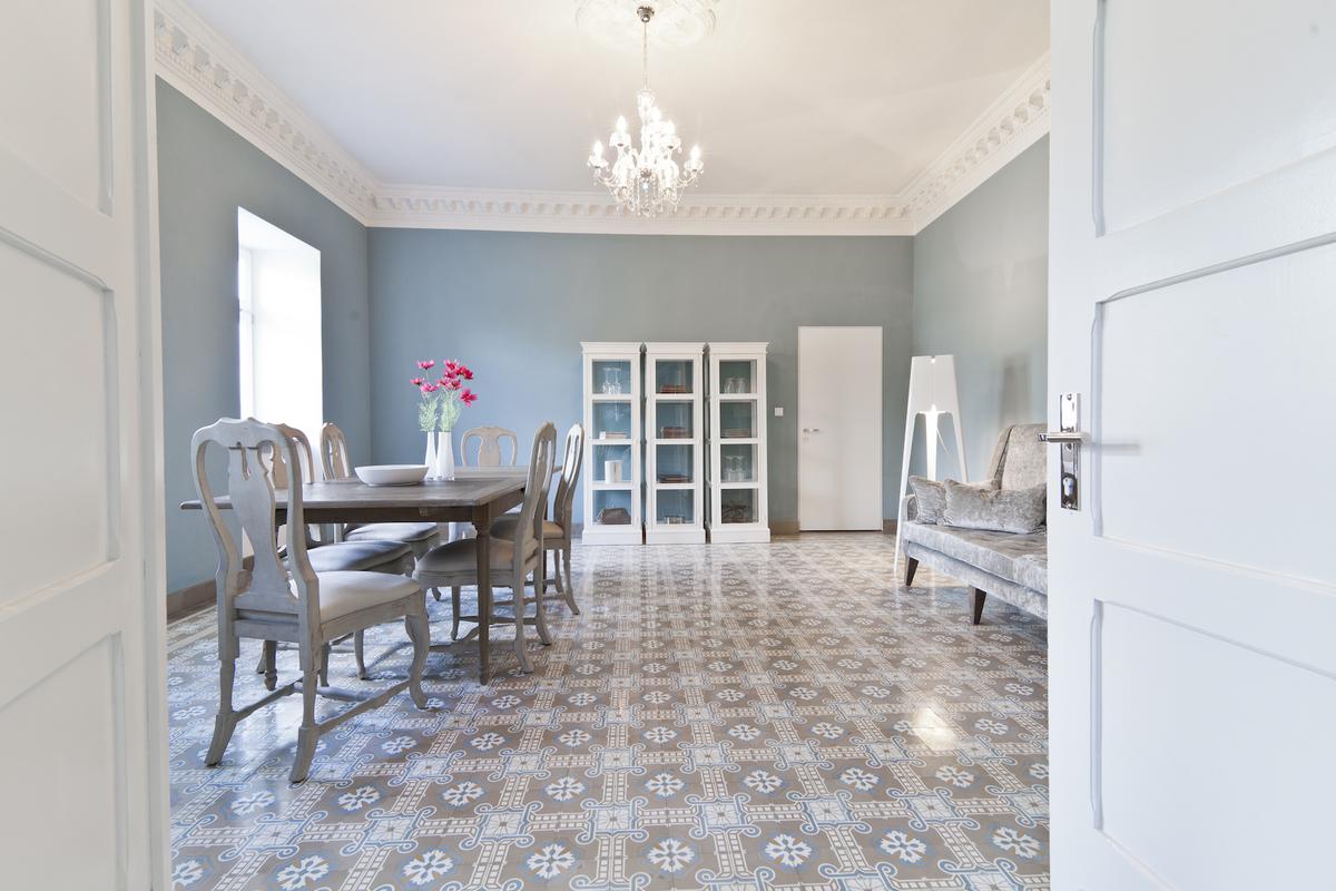 A challenge and an opportunity at the same time, because the ensemble built between 1913 and 1921 as a representative château, whose completion was prevented by the two world wars, was a listed building and at the same time had potential for change and expansion. Today, in the entrance hall hangs a drawing of the original building design, which was planned to be almost twice as large. A couple found it when clearing out the warehouse and gave it to the company owners as a gift. Instead of champagne, cement mosaic, terrazzo and pavement slabs as well as wall paints are now stored in the long vaulted corridors, which are delivered all over the world from the new 1,000 square metre glass hall. The representational idea of the champagne house also lives on in the exhibition and office spaces. This can be experienced most impressively in the Blue Salon with its surrounding stucco frieze, corresponding VIA floor tiles and spectacular view of the Rhine. The company's philosophy of continuing to build, yet not finishing, leaves room for future changes: living building culture between the old and the new!