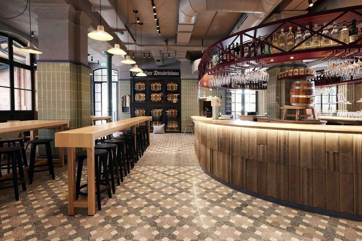 Im Benediktiner Weissbräuhaus in Gießen wurde Tradition neu definiert. Durch die gelungene Mischung aus alt und neu entstand das urig moderne Flair mit gemütlichen und einladenden Räumen. Durch den geschickten Wechsel von Muster und einfarbigen Fliesen aus grobem Terrazzo entstehen Zornierungen und Wegeführungen. Erwartungen an ein Brauhaus werden erfüllt und dabei noch weit übertroffen. Ein Prosit!