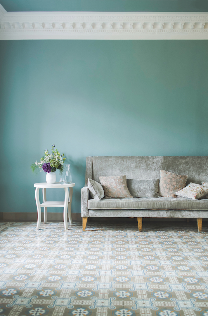 VIA Kreidefarbe 308 Blauer Salon Musterbeispiel mit hellen Zementmosaikplatten