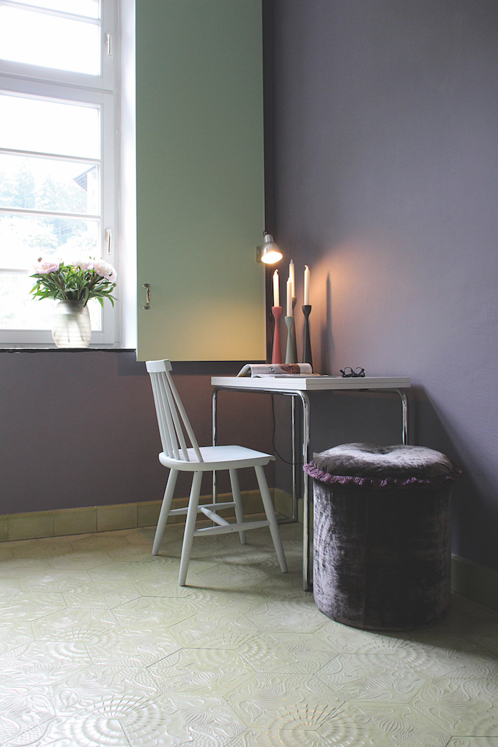 VIA Kreidefarbe 40 Purpurgrau an Wänden Gaudiplatte hellgrün auf dem Boden Schreibtisch und Stuhl