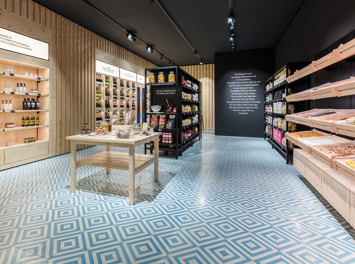 Das Fischgrätenmuster in graublau und weiß hat VIA für den Foodbereich ”all goods” auf Wunsch von Vitra gefertigt. Der schlichte Raum zieht an. Ehrliche, langlebige Materialien bieten dem Kunden einen Raum, in dem er sich frei bewegen und umschauen kann. Das Muster öffnet den Raum und weist Richtungen.