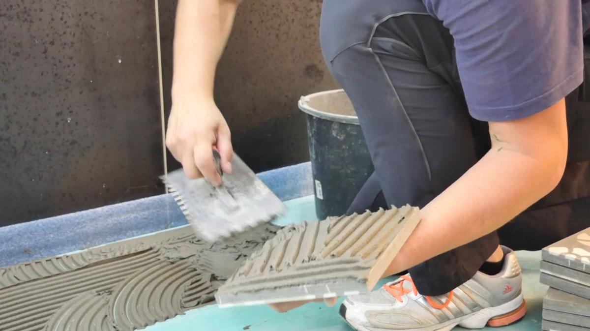 Der Kleber wird mit einer 10er Zahnkelle auf Boden/Wand und Platte aufgetragen. Dadurch erzielt man eine ausreichende Kleberdicke, um beim Andrücken eine ebene Oberfläche ohne Überzahn zu erzielen. Es ist unbedingt das Buttering-Floating Verfahren anzuwenden.
