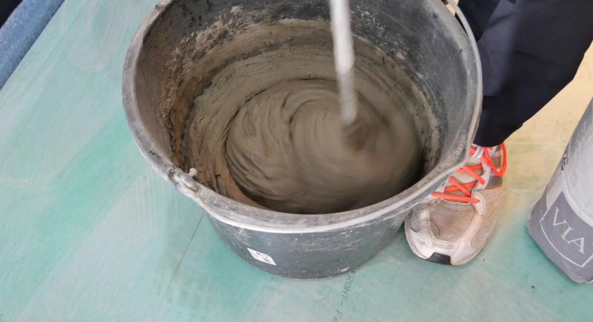 Die passende Menge Kleber wird nach den Angaben auf der Verpackung des VIA Plattenklebers angerührt. Die VIA Plattengrundierung bindet den Reststaub und reduziert die Saugfähigkeit von stark saugenden Untergründen. Bei Zementestrichen wird die Grundierung im Verhältnis 1:3 mit Wasser verdünnt, bei Calziumsulfatuntergünden muss unverdünnt aufgetragen werden.